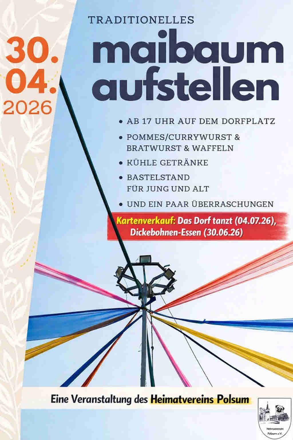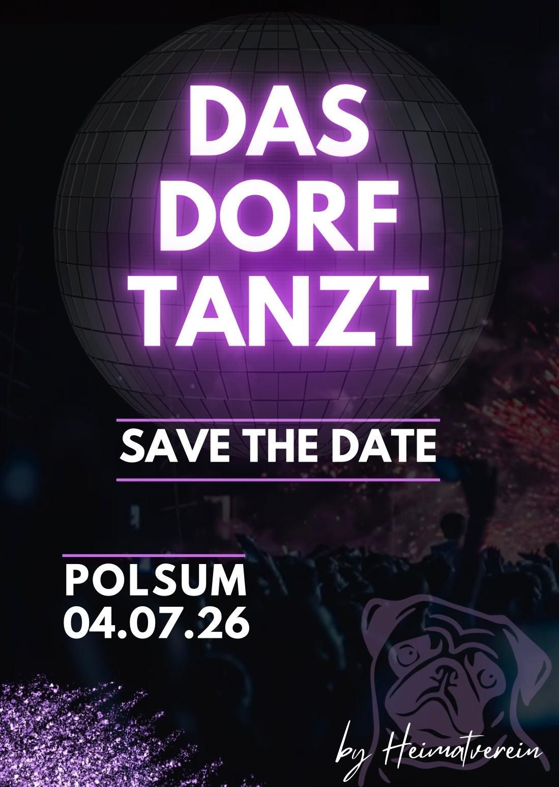 Sa., 04.07.2026 · 20:00 Uhr Ort: wird Ende April bekannt gegeben Seid dabei, wenn DAS DORF TANZT ! Euch erwartet eine legendäre Nacht mit guter Musik, kühlen Drinks und bester Stimmung. Eintritt: 10 € pro Karte Vorverkauf für Heimatverein-Mitglieder: beim Maibaumaufstellen am 30.04.2026 von 17:00–19:00 Uhr