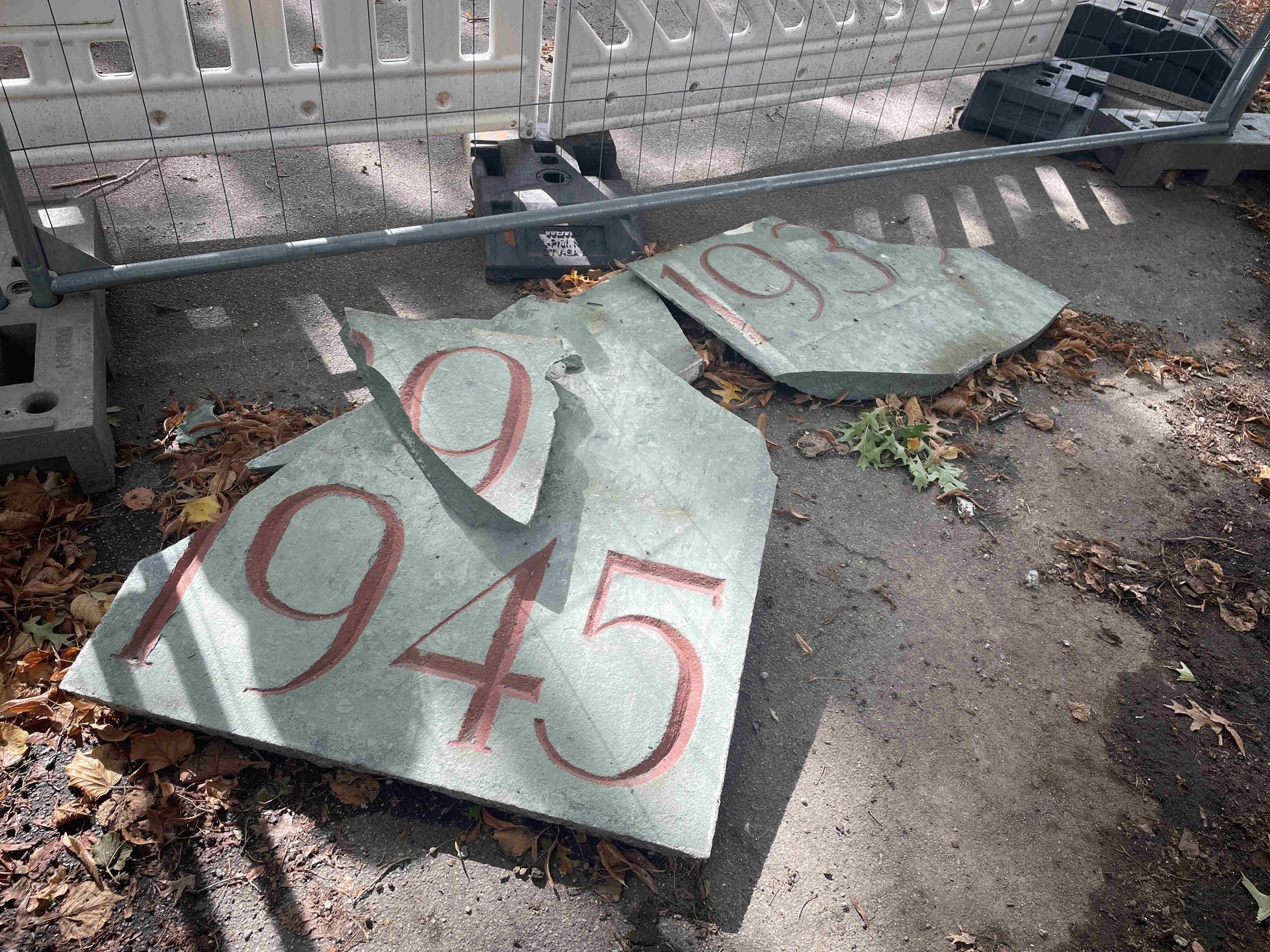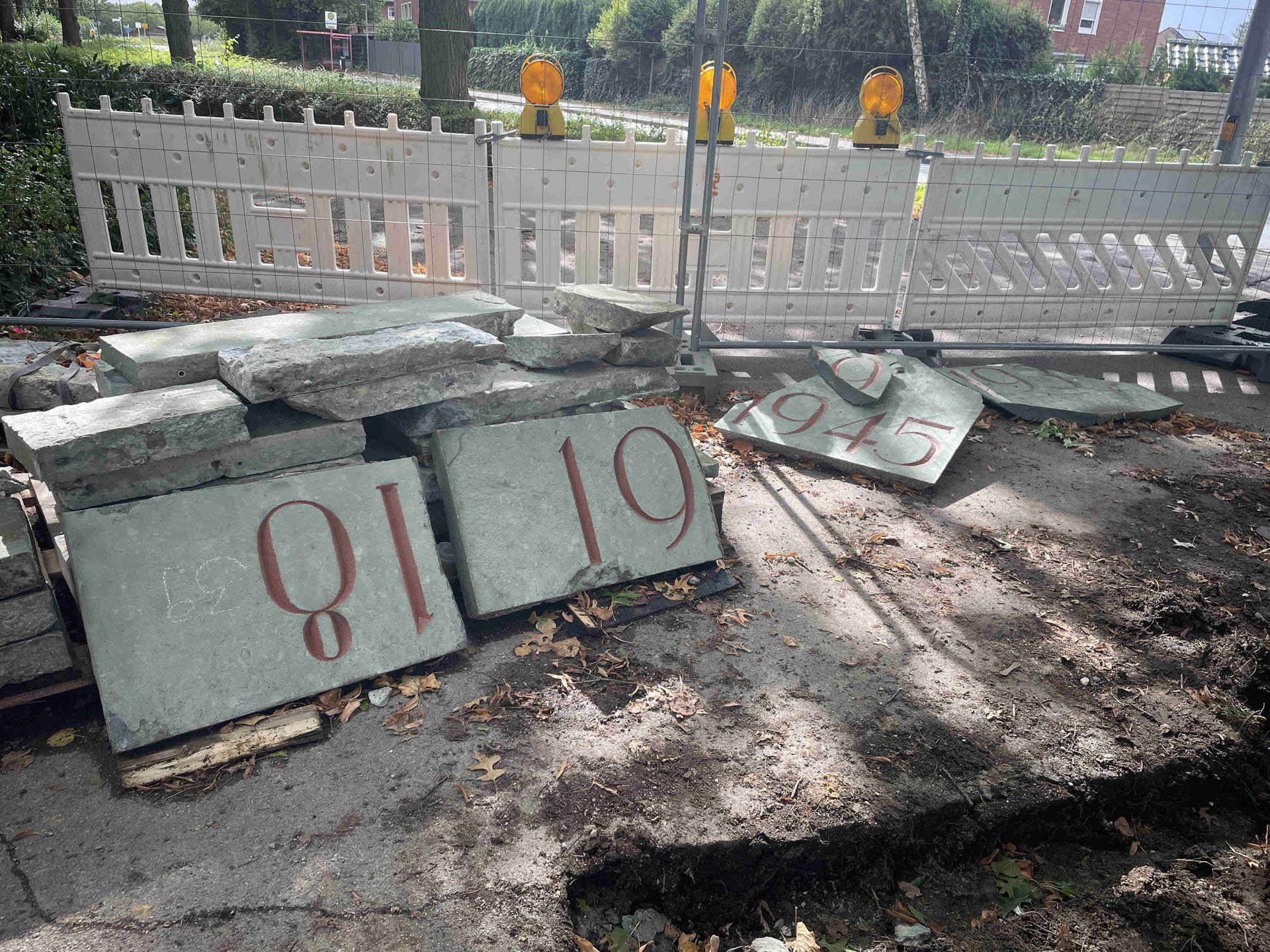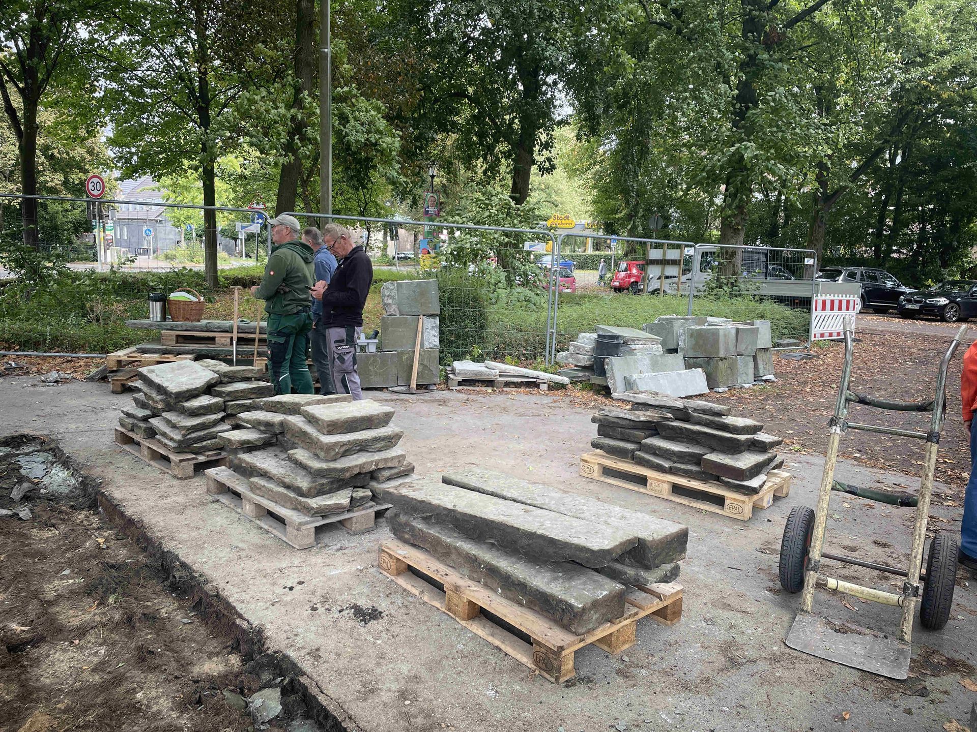 Die Arbeiten am Projekt "EuM – Erinnerungs- und Mahnmal" gehen weiter. Die Firma Heilkenbrinker hat die Fassade aus Anröchter Sandstein abgebaut und wird die restlichen Steine abtransportieren. In den nächsten Monaten wird sie die Steine bearbeiten und für den Wiederaufbau vorbereiten. Heute haben wir die Bodenplatten gesichert und dokumentiert, um sie später wiederverwenden zu können. Bald wird das restliche Denkmal abgerissen.