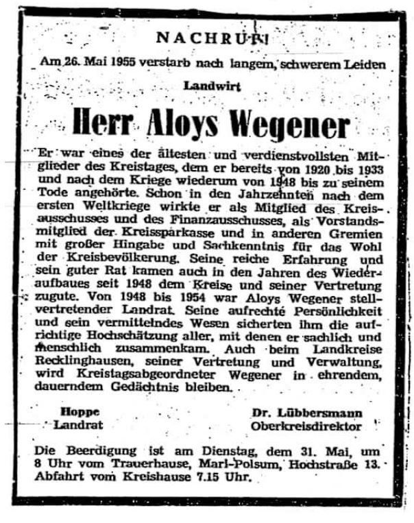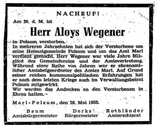 Er wurde am 16. Juni 1881 geboren, war Kaufmann und Kommunalpolitiker. In seinem Buch „Marl von 1914 – 1974“ berichtet der Heimatforscher Helmut Madynski über Aloys Wegener: (1) In einer Sitzung der Amtsvertretung unter dem Vorsitz des Regierungsassessors Graf Matuschke am 27.7.1923 wurde beschlossen, den Wiegemeister August Hoffmann und den Kaufmann Aloys Wegener zu unbesoldeten Beigeordneten vorzuschlagen.