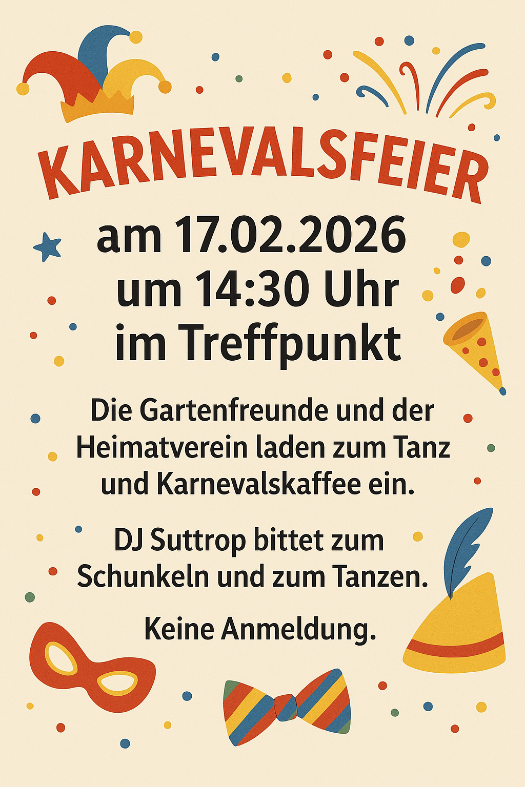 17.02.2026 Karneval mit den Gartenfreunden Ort: Treffpunkt Beginn: 14:30 Uhr Die Gartenfreunde und der Heimatverein laden zum Tanz und Karnevalskaffee ein. Mit leckerem Kaffee, Kuchen und karnevalistischer Musik wollen wir einen gemütlichen Nachmittag verbringen. Heute bittet DJ Suttrop zum Schunkeln und zum Tanzen. Kostüme sind erwünscht Eine Anmeldung ist nicht erforderlich. Zwingend sollten aber Tanzbeine und gute Laune in den Treffpunkt mitgebracht werden. Bringt Freunde, Nachbarn und Bekannte mit.