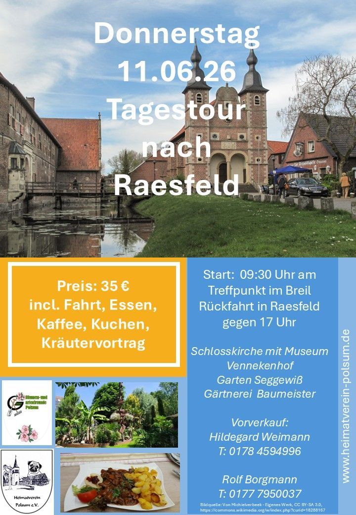 Entdeckt Raesfeld auf einer entspannten Tagestour voller Eindrücke und Genuss. Für 35 € sind Fahrt, Eintrittsgelder, Mittagessen, Kaffee & Kuchen sowie ein spannender Kräutervortrag inklusive. Unser Tag in Kürze: Start um 09:30 Uhr am Treffpunkt im Breil Schlosskirche & Museum Vennekenhof Garten Seggewiß Gärtnerei Baumeister Rückfahrt gegen 17:00 Uhr Tickets ab 01. Mai 2026 im Vorverkauf: Hildegard Weimann – 0178 4594996 Rolf Borgmann – 0177 7950037 Bei Veranstaltungen an denen ein Kostenbeitrag, eine Teilnahmegebühr oder eine Essenmarke gekauft werden müssen, geht es nicht anders, als dass wir auf vorherige Bezahlung bestehen müssen. Leider sind wir auf Kosten sitzen geblieben, an denen Teilnehmer vergessen haben zu kommen oder sich kurzfristig entschuldigt haben. Wir sind jedoch finanziell in Vorleistung getreten. Die Verluste sollen nicht andere Mitglieder bezahlen.